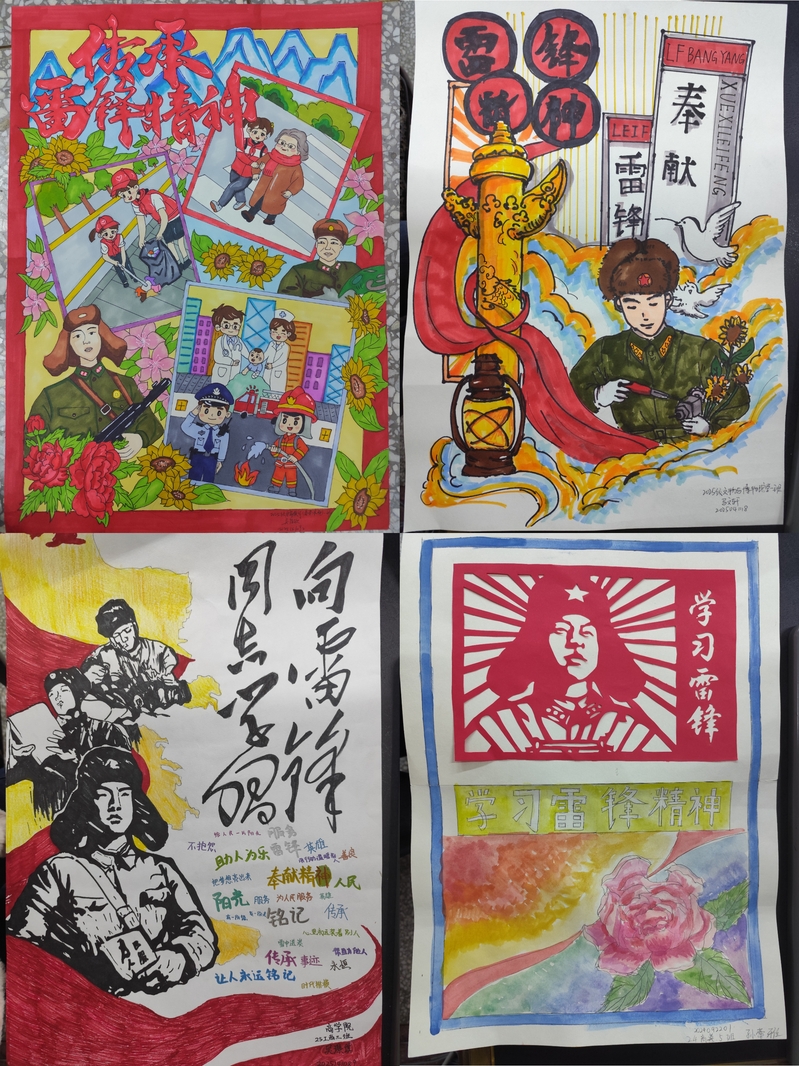 自活动启动以来,全体同学积极响应、踊跃参与,紧密结合学院师范专业特色与“双师双铸”品牌特色,以剪纸、绘画、书法等多元形式传承雷锋精神。大家扎根校园生活沃土、聚焦身边动人故事,将对雷锋精神的深刻理解与独特感悟,巧妙融入笔尖的灵动、倾注于作品的灵魂。无论是精巧细致的剪纸、色彩绚丽的绘画,还是笔力遒劲的书法作品,每一份都承载着青年学子对奉献精神的由衷崇敬,对责任使命的坚定坚守,淋漓尽致地展现出新时代大学生积极向上、向善向美的卓越精神风采。